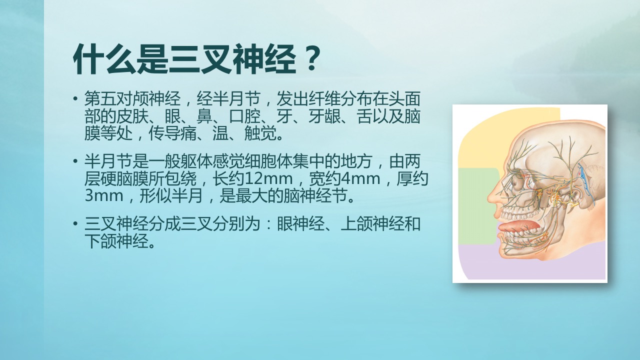 三叉神经位于颅内,起于脑桥为混合神经含有躯体感觉和内脏运动纤维。躯体感觉神经纤维组成粗大的感觉根,分布于头面部皮肤、眼、鼻、口腔黏膜、牙和牙龈,以及脑膜等处,传导痛、温、触觉。