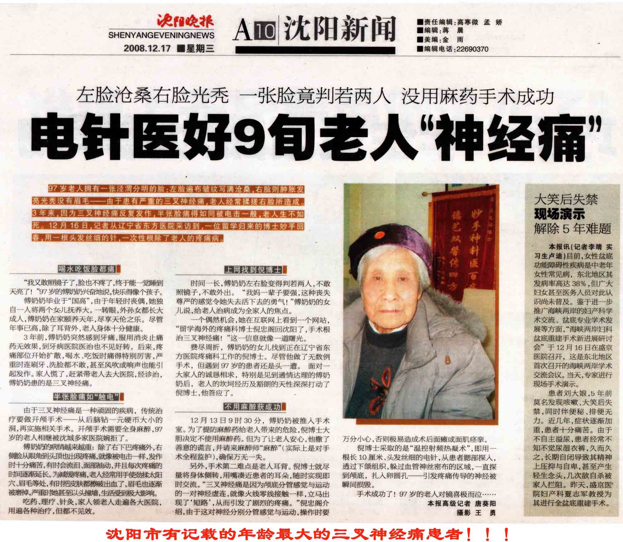 诊疗团队精心制定个性化方案,在老人及其家属的全力配合下,成功为老人解除了病痛,这一暖心事迹也被《沈阳晚报》报道。术后,傅奶奶尽享八年无痛安康生活,最终于2016年以106岁高龄在睡梦中安详仙逝。
